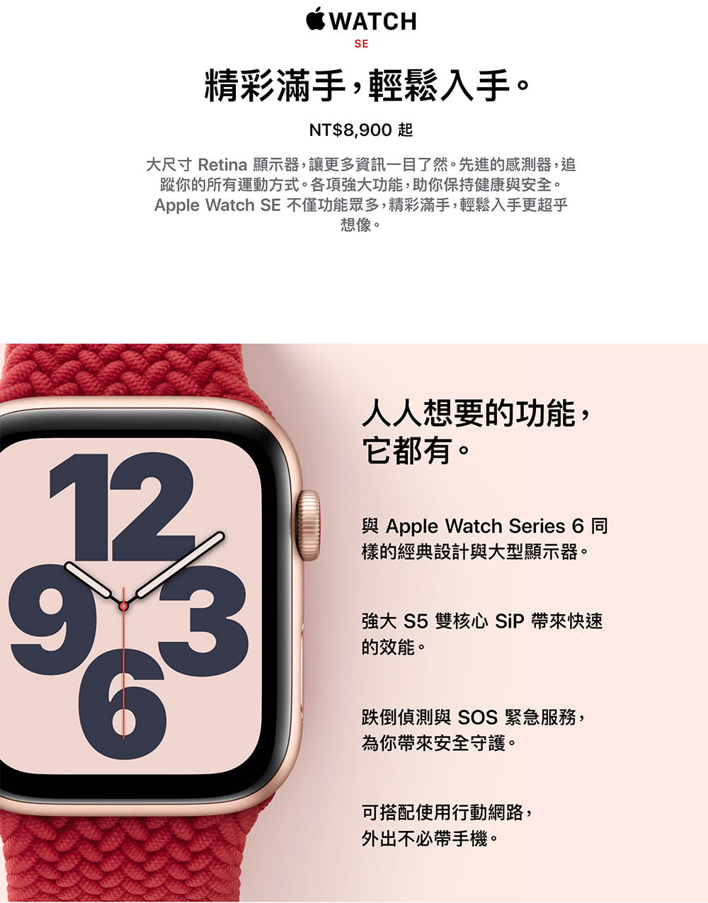 momo購物 網路價 10699 元,大尺寸 Retina 顯示器,人人想要的功能,它都有,100%再生航太等級合金材質 ,30W大功率快充,插頭隱藏收納... 規格說明 完美細緻 打造獨一無二舒適感 運動錶帶超值組★【Apple 蘋果】Watch SE LTE版40mm(鋁金屬錶殼搭配運動型錶帶)